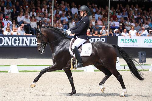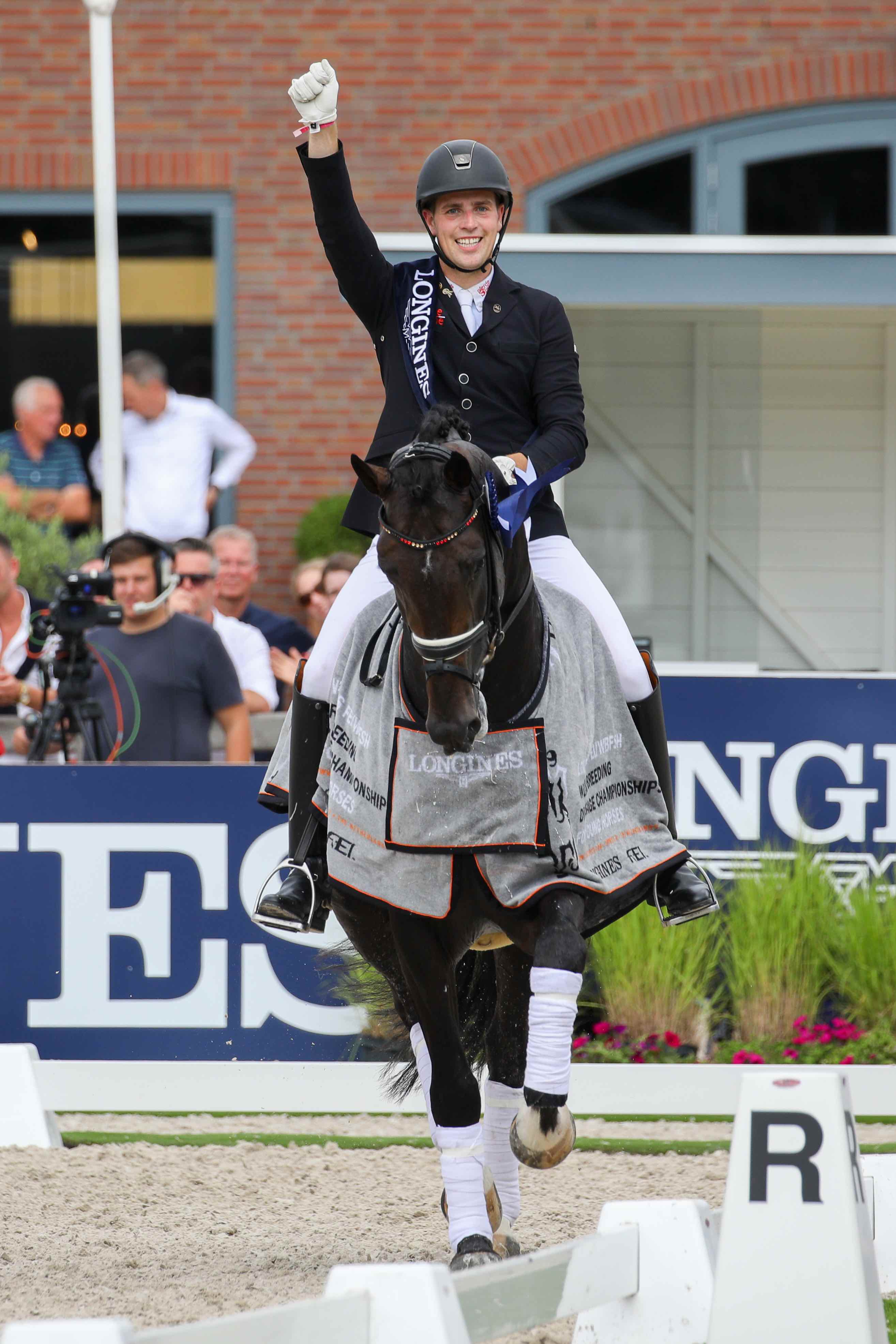 Der von uns gezogene Zucchero v. Zonik aus unserer St.Pr. Performance v. Prince Thatch xx - Donnerhall - Pik Bube wird unter Frederik Wandres Weltmeisterder jungen Dressurpferde in Ermelo!