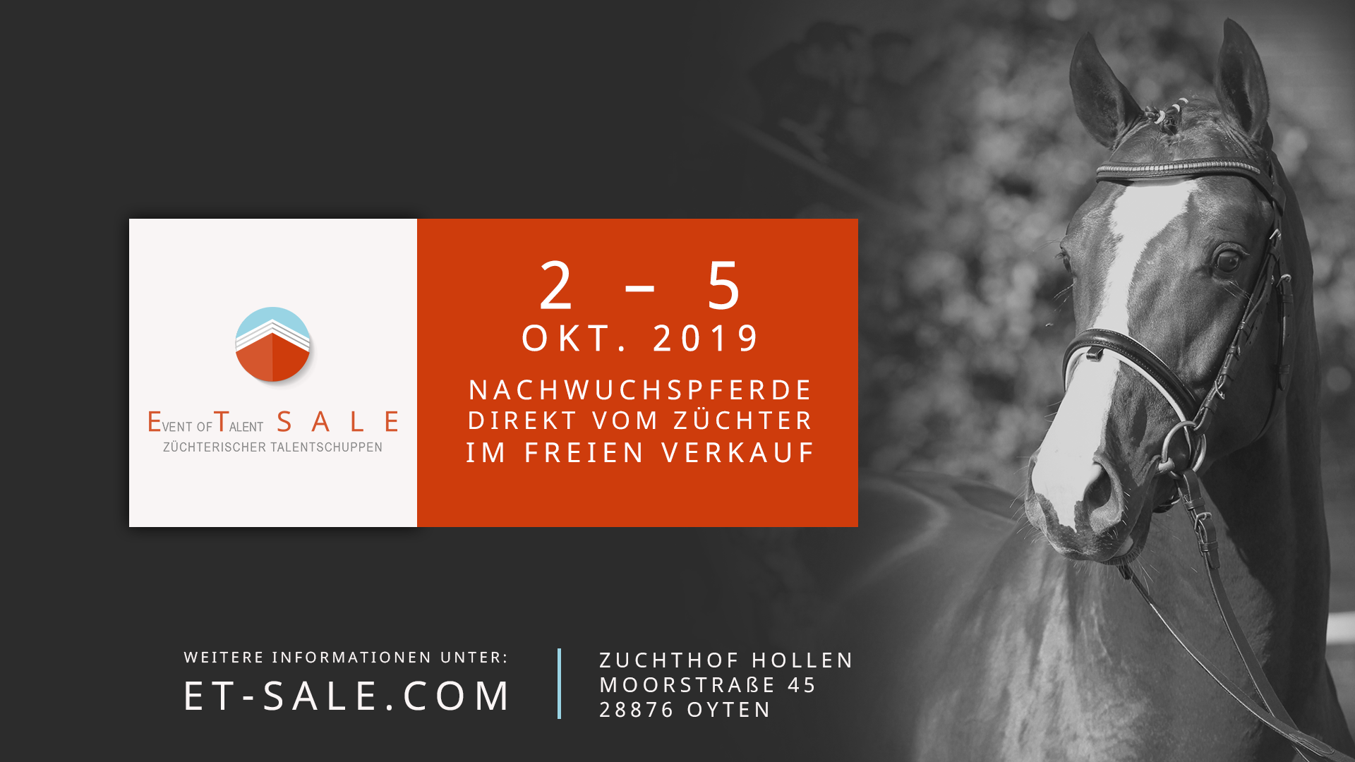 Vom 02. - 05. Oktober 2019 findet die 9. ET Sale Pferdeverkaufswoche statt. In diesem Jahr sind wir wieder mit unseren Verkaufspferden auf dem Zuchthof Hollen in Oyten für die Veranstaltung.