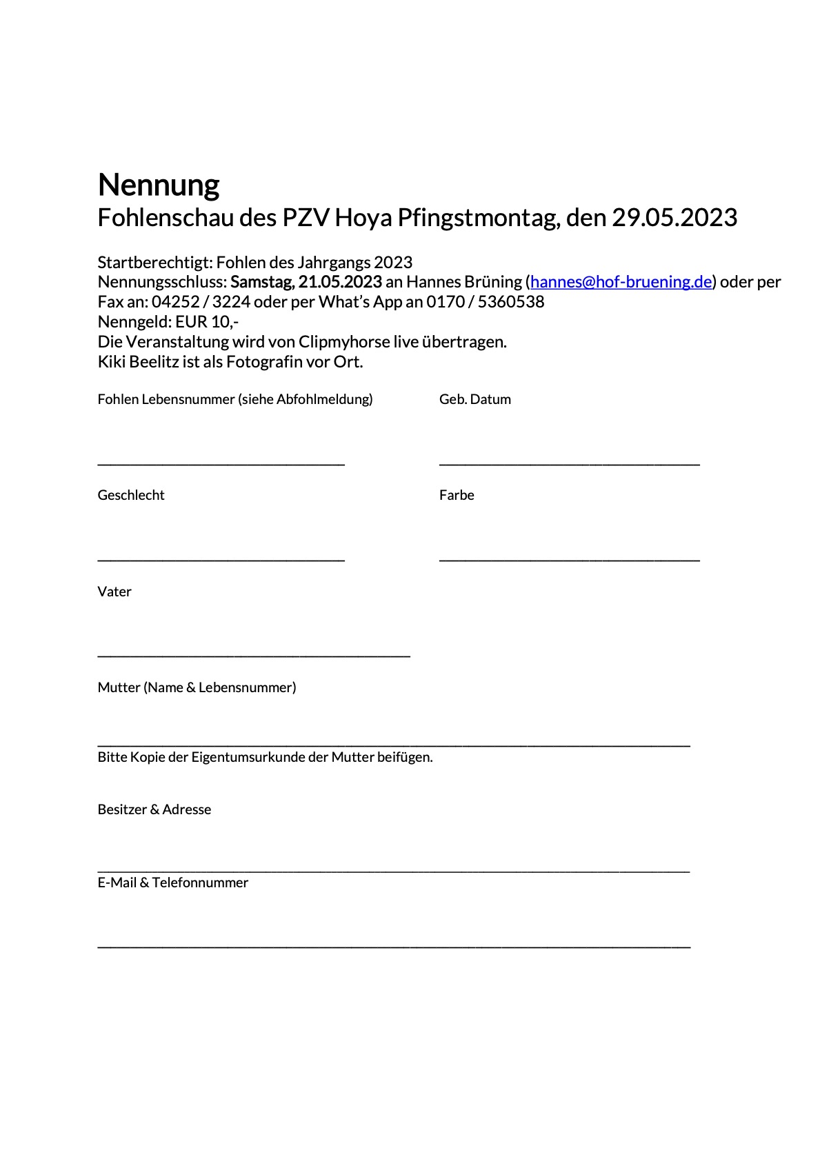 Wer mit seinem Fohlen bei der diesjährigen Fohlenschau des PZV Hoya teilnehmen möchte, sendet bitte das beigefügte Nennungsformular ausgefüllt bis zum 21.05.2023 an