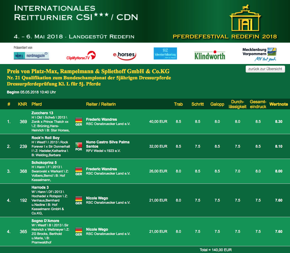Mit dem Hengst Zucchero aus unserer St.Pr.St. Performance von Prince Thatch xx - Donnerhall konnte er die Bundeschampionatsqualifikation der 5-jährige Dressurpferde in Redefin gewinnen.